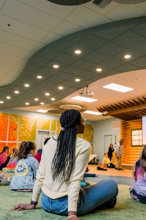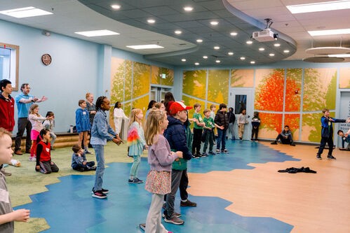 Children in PreK-Kindergarten meet downstairs in the Lodge and end their time in the Preschool Hallway.